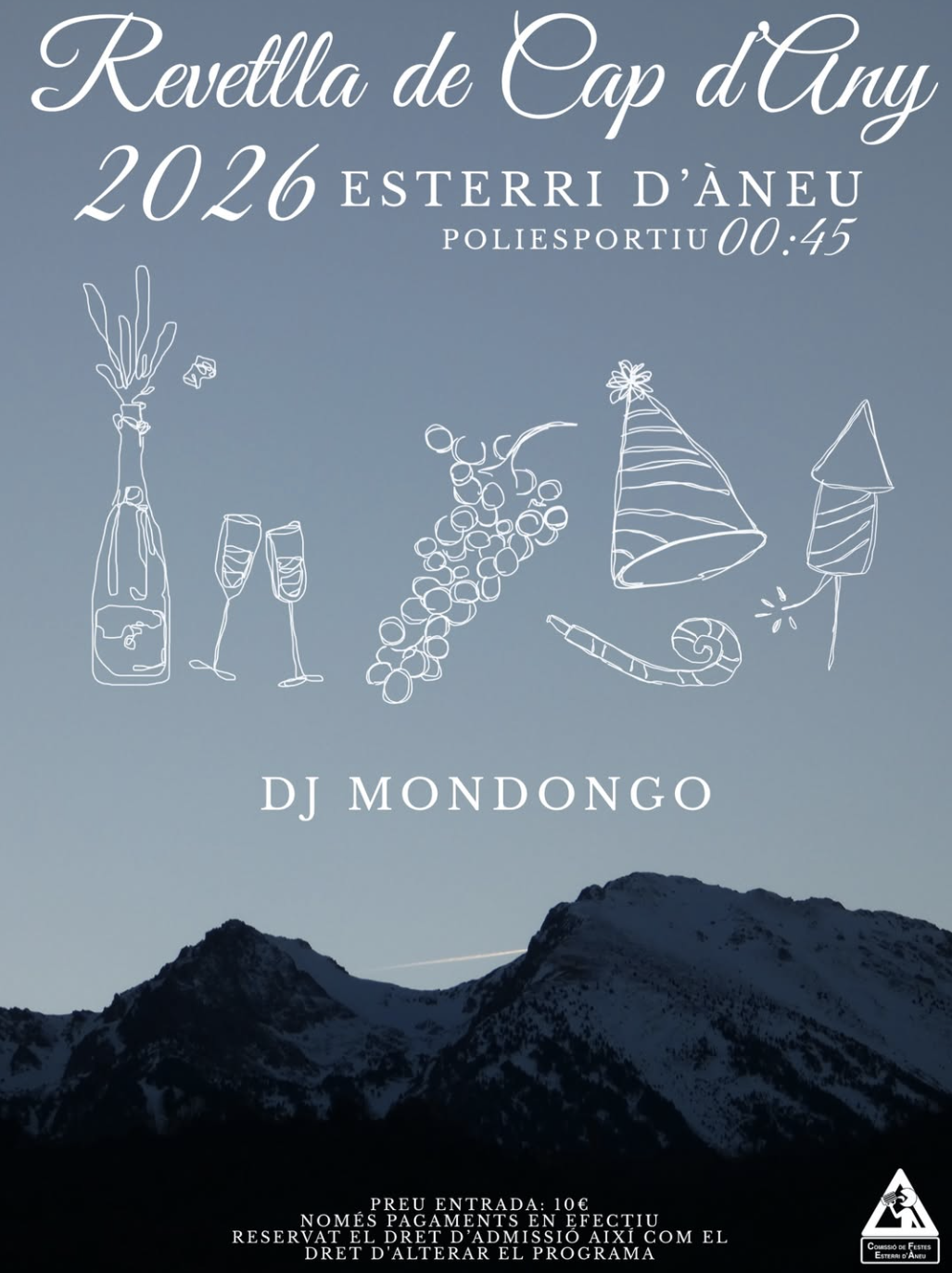 Esterri d’Àneu celebrarà el Cap d’Any 2026 al poliesportiu, amb l’inici de la festa a les 00.45 h. La música anirà a càrrec de DJ Mondongo, que animarà la primera nit de l’any. L’entrada té un cost de 10 euros i només es pot pagar en efectiu. L’organització es reserva el dret d’admissió i de modificar el programa.