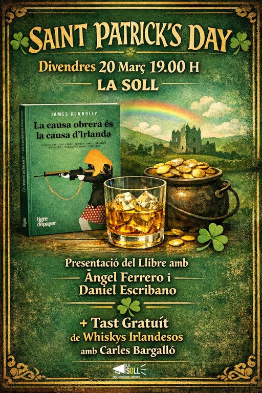 L'espai autogestionat i cooperatiu La Soll se suma a la celebració de Saint Patrick’s Day a Tàrrega amb una proposta cultural que combina literatura, pensament crític i gastronomia. La Secció de Pensament Crític organitza la presentació del llibre “La causa obrera és la causa d’Irlanda”, una selecció d’articles del pensador i activista James Connolly, figura clau del moviment obrer irlandès que va destacar per la seva lluita incansable contra l’imperialisme i el capitalisme.