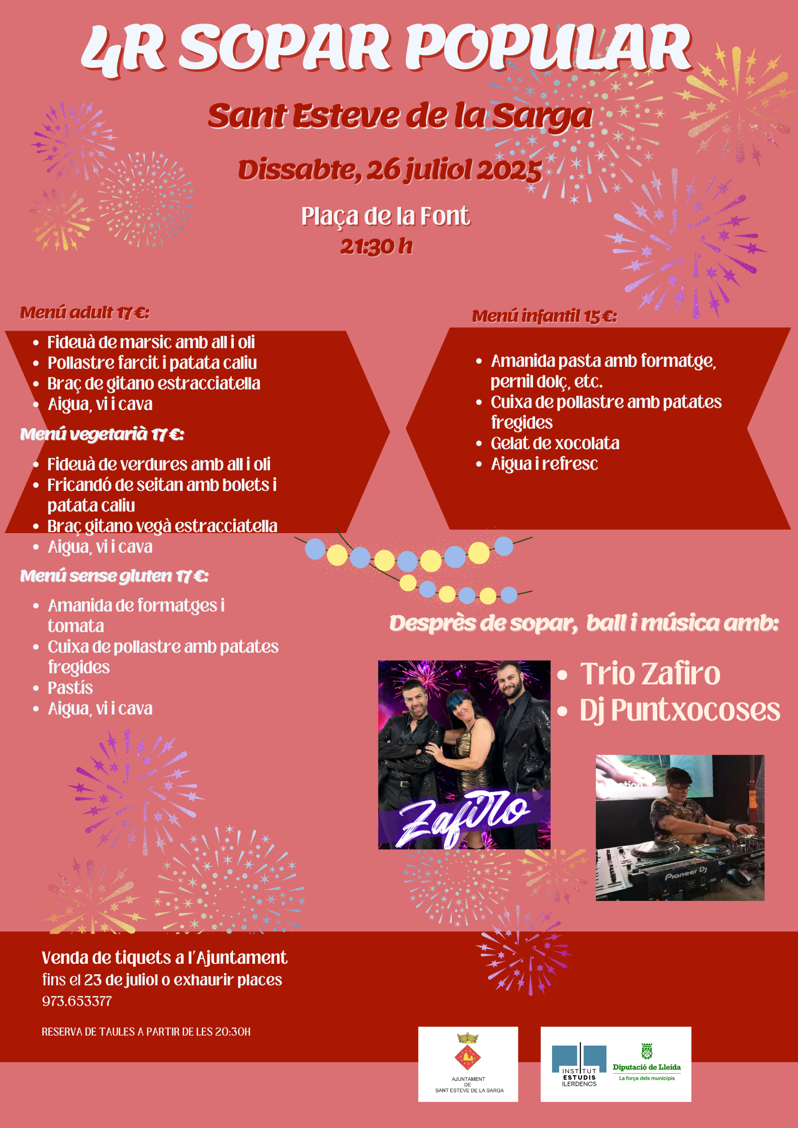 Dins la programació de l’Estiuet de la Feixa, arriba la 4a edició del Sopar Popular de Sant Esteve de la Sarga, una vetllada a la fresca plena de bon ambient, música i diversió. Aquest any, l’animació musical anirà a càrrec del Trio Zafiro i Dj Puntxocoses.