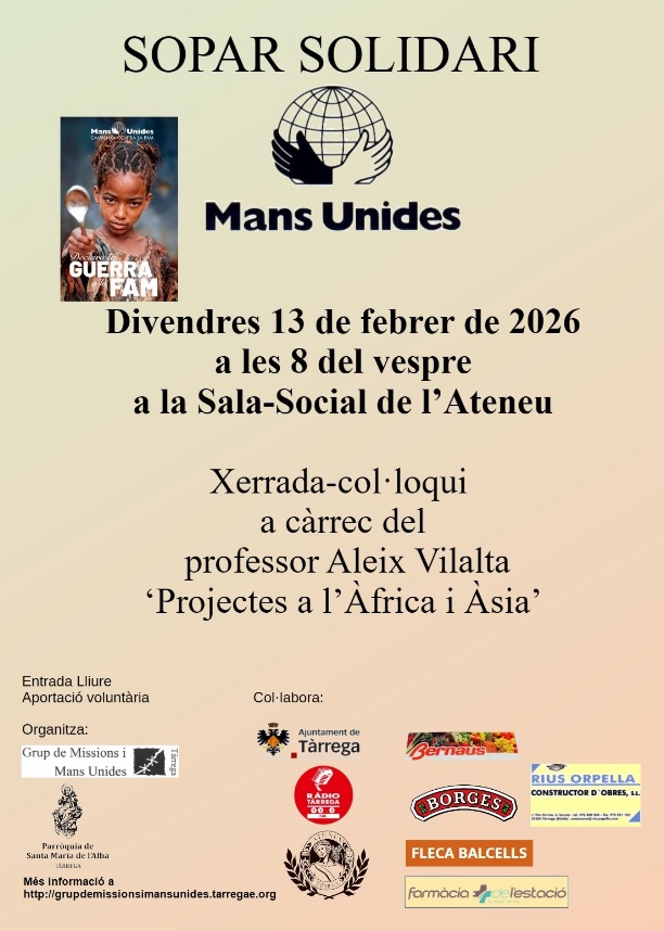 El Grup de Missions i Mans Unides de Tàrrega organitza una nova edició del seu Sopar Solidari amb la participació del professor Aleix Vilalta, col·laborador en projectes de desenvolupament a l'Àfrica i Àsia.