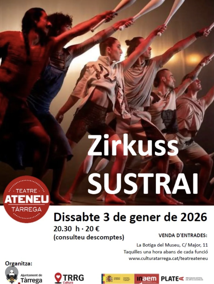 Espectacle de circ contemporani procedent del País Basc. La companyia donostiarra Zirkuss arriba al Teatre Ateneu amb ‘Sustrai’, peça multidisciplinària que fusiona acrobàcies, dansa avantguardista i arts plàstiques. El títol significa "arrels" en euskera i l'obra explora temes com el procés creatiu, els llaços entre persones i la memòria compartida.