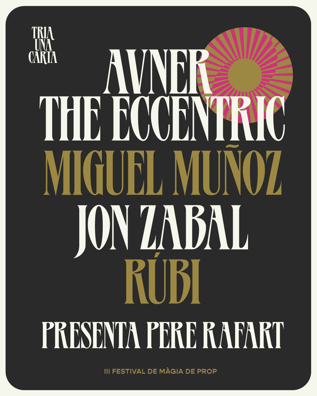 El 3r Festival de Màgia de prop de Solsona, "Tria una carta", busca l’equilibri entre artistes consolidats com Avner the Eccentric, considerat una llegenda en el món del clown, i Miguel Muñoz, campió mundial de màgia FISM el 2018 i el 2015, amb figures més alternatives del sector, com el mentalista basc Jon Zabal o Rúbi Férez, especialitzat en micromàgia i números amb monedes. Tots mostren els seus dons en l'espectacle en format late show que presenta el solsoní Pere Rafart els dies 10 i 11 d'octubre al teatre comarcal.