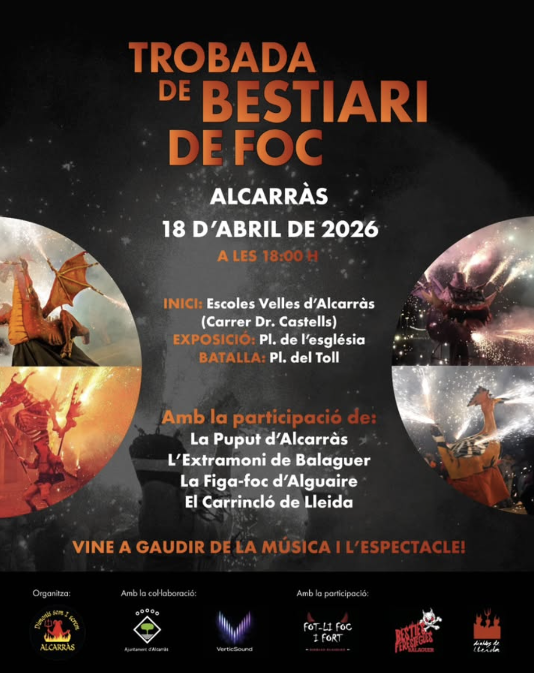 Hi participaran la Puput d’Alcarràs, l’Extramoni de Balaguer, la Figa-foc d’Alguaire i el Carrincló de Lleida, en una proposta plena de foc, música i espectacle.