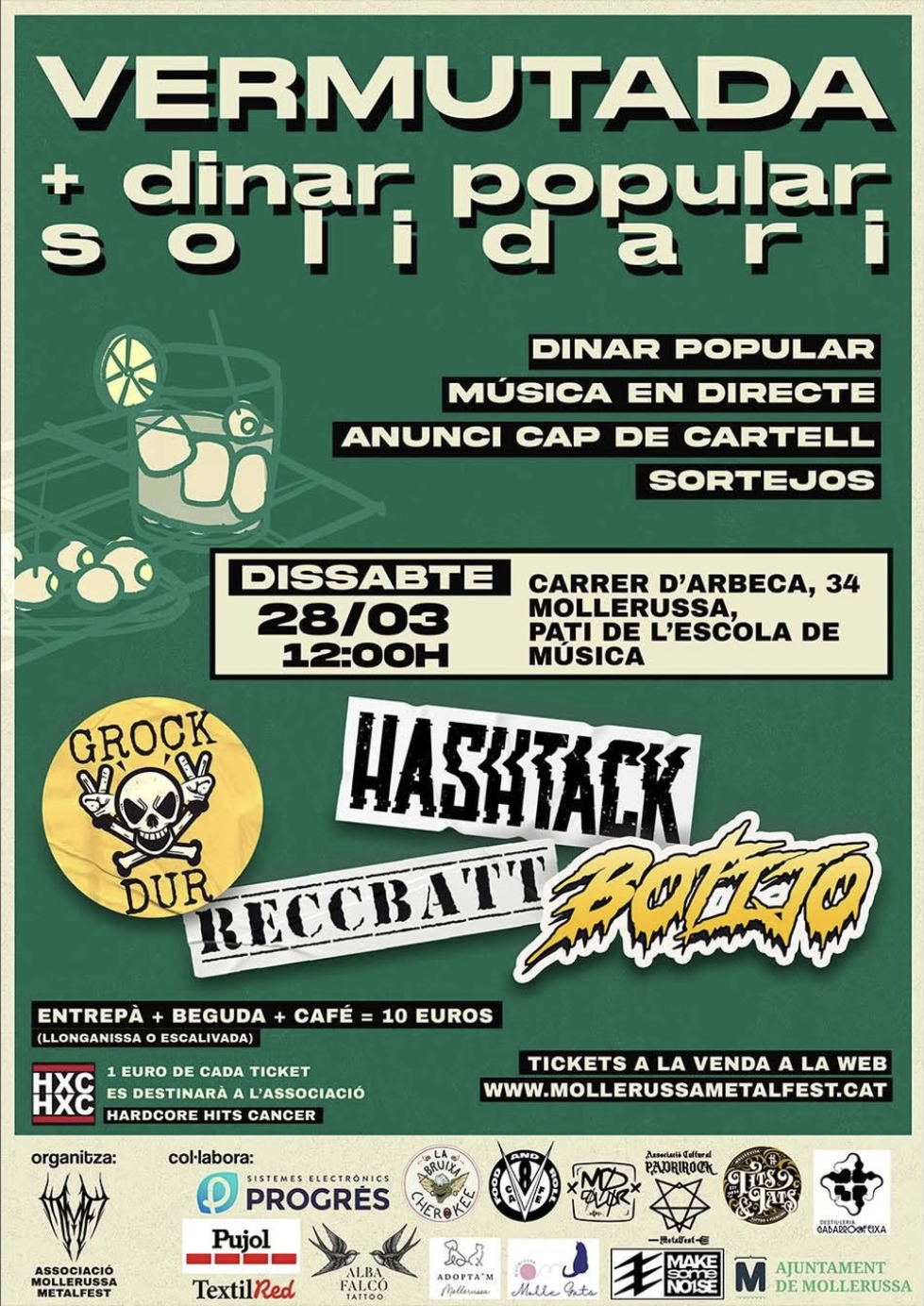 Vermutada solidària amb dinar popular, música en directe, sorteigs i anunci del cartell, al pati de l’Escola de Música de Mollerussa, amb actuacions de Hashtack, Reccbrat i Boteo.