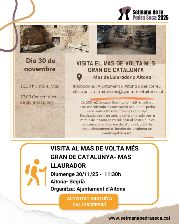 Obrim les portes del Mas de volta més gran de Catalunya. Mas Llaurador, de 200 m2 de superfície interior i 5,6 m d’altura, està considerada la construcció popular de pedra seca amb volta més gran de Catalunya. Encaixada dins d’un turó, la terra emprada com a motlle de la volta es va col·locar al sostre, que es va convertir en una era des d’on s’introduïa la palla directament a l’interior de la cabana, on s’emmagatzemava. Gaudirem de les explicacions de la història del Mas i d'un concert de clarinet i piano.