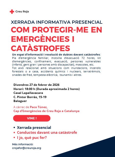 Activitats familiars · Col·loqui · Conferències · Trobada · Xerrada Xerrada informativa 'Com protegir-me en emergències i catàstrofes', a càrrec de Paco Túnez, Cap d'Emergències de Creu Roja a Catalunya. 27 de febrer, 18.00 hores. Casal Lapallavacara. Balaguer.