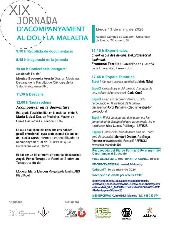 Seminaris i jornades XIX Jornada d'acompanyament al dol i a la malaltia Una jorna plena de xerrades, activitats i espais temàtics per saber acompanyar en aquest moments vitals